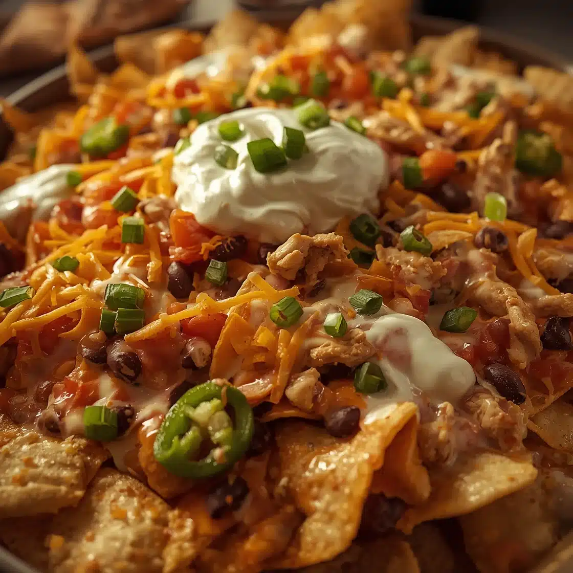 Classic toppings include diced tomatoes, green onions, jalapeños, sour cream, and guacamole. Black olives, cilantro, and pickled red onions also work wonderfully. For the best creamy chicken nachos recipe at home, I recommend offering variety.